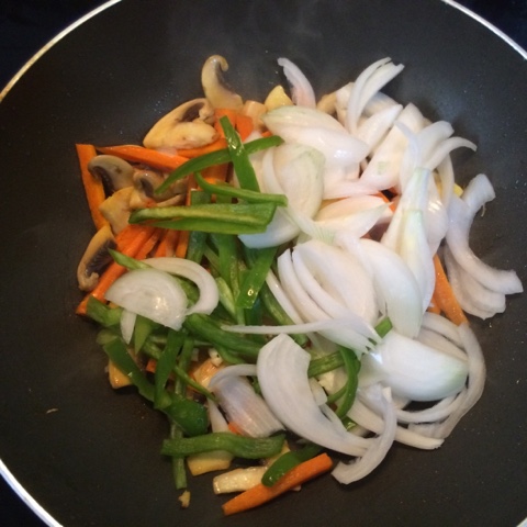 Cuando esté dorado lo sacamos y reservamos. En el mismo aceite añadimos las verduras, primero los champiñones y la zanahoria, y pasados un par de minutos la cebolla, el pimiento y el ajo.